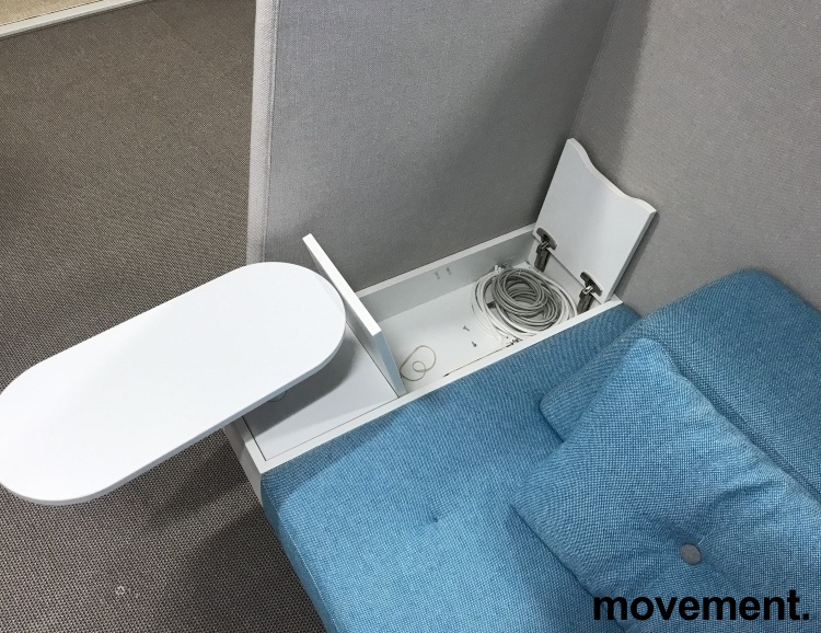 modell med sidebord i lyst beige / blått ullstoff / hvitt, 130cm bredde, pent brukt